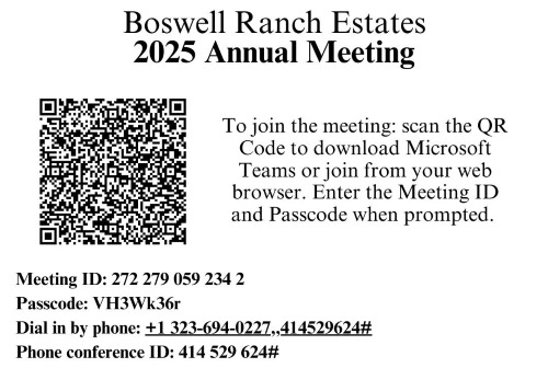 Click here to download and read the meeting packet: Click here to download and read the Boswell Ranch Estates Annual Meeting 2023